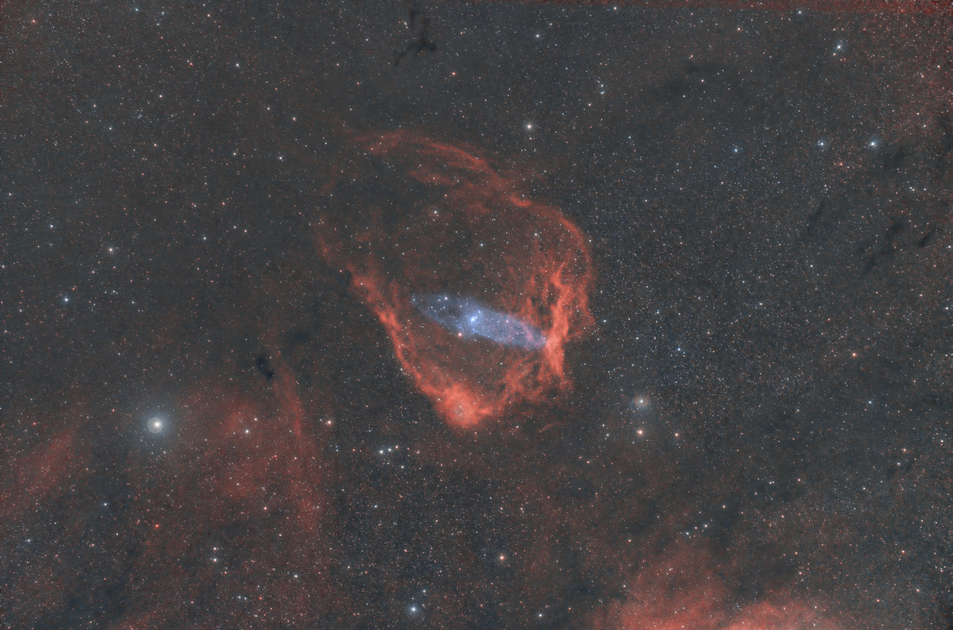 Le jeu d’images a été enregistré avec un appareil photo Sigma FP plein format refiltré Astronomik et couplé à un filtre dual-band L-Extreme Optolong 7 nm.